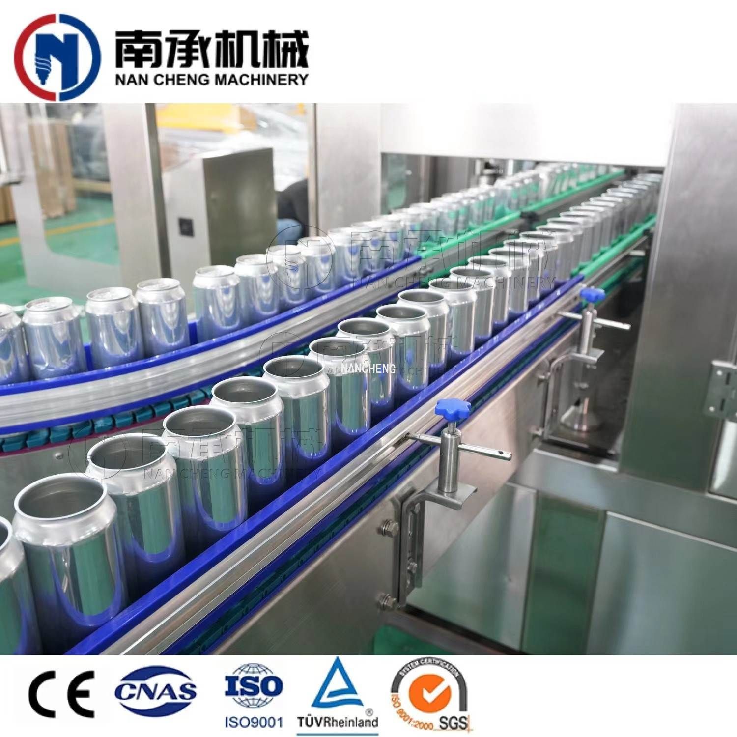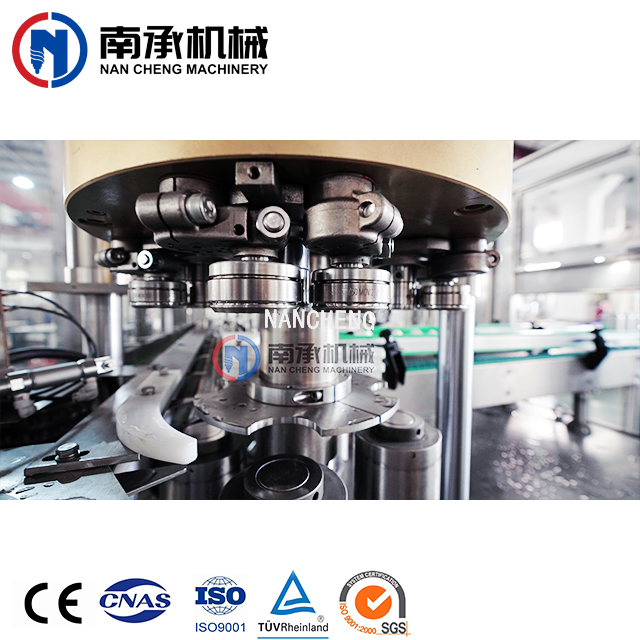 易拉罐灌装机采用常压灌装原理,当空罐经拨轮进入升降托罐盘后,灌装阀和空罐对中,空罐升起并密封同时自动打开灌装阀的阀口,当灌装液面堵住阀的回气管口时停止灌装。灌装桶采用环形桶结构,减少了生产过程中的灌装桶的重量,使易拉罐生产设备在旋转过程中稳定,料液通过管路系统从易拉罐灌装机底部进入灌装桶内,可减少物料的冲击,并能有效防止起泡,使灌装精度高。