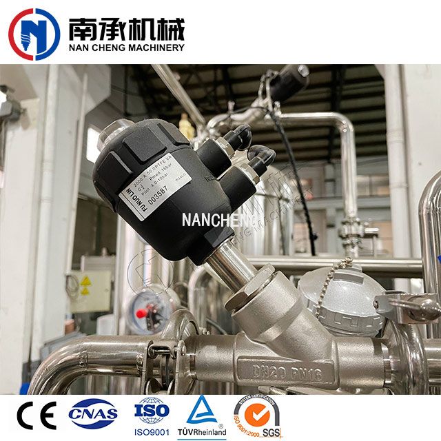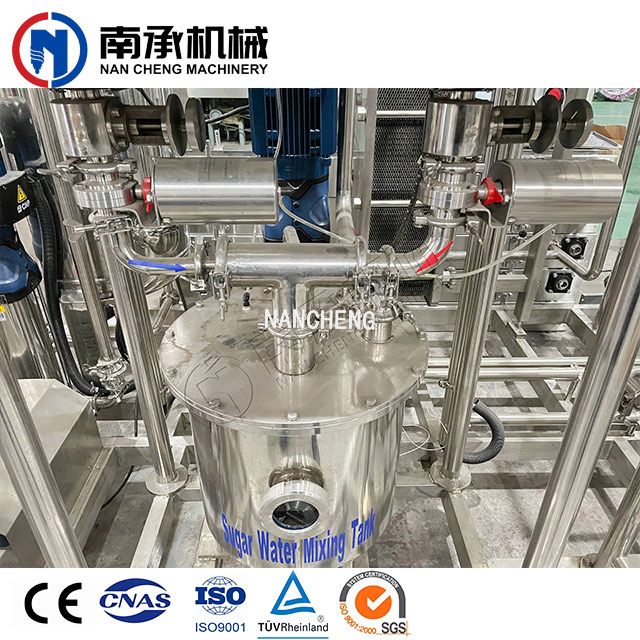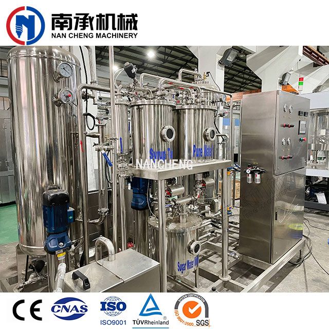 其工艺过程为:糖浆和净水经配比器按比例进入混合罐混合,用泵输入碳酸化罐,在碳酸化罐内装有管,罐内通有制冷剂、使混合后的物料冷却,以融入足够的二氧化碳。为保证二氧化碳与处理水有足够的接触时间,二氧化碳从进入碳酸化罐之间就开始充入。碳酸化后的物料进入灌装机,然后灌入容器中张家港市南承机械有限公司
